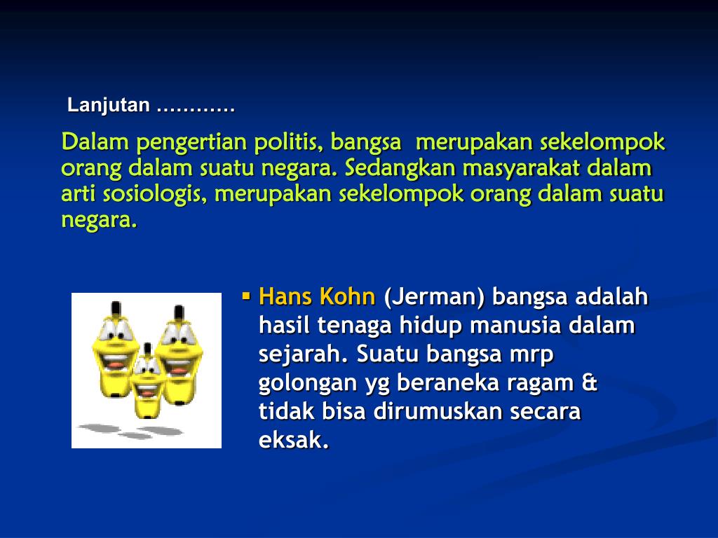 Lanjutan ………… Dalam pengertian politis, bangsa merupakan sekelompok orang dalam suatu negara. Sedangkan masyarakat dalam arti sosiologis, merupakan sekelompok orang dalam suatu negara. • Hans Kohn (Jerman) bangsa adalah hasil tenaga hidup manusia dalam sejarah. Suatu bangsa mrp golongan yg beraneka ragam & tidak bisa dirumuskan secara eksak.