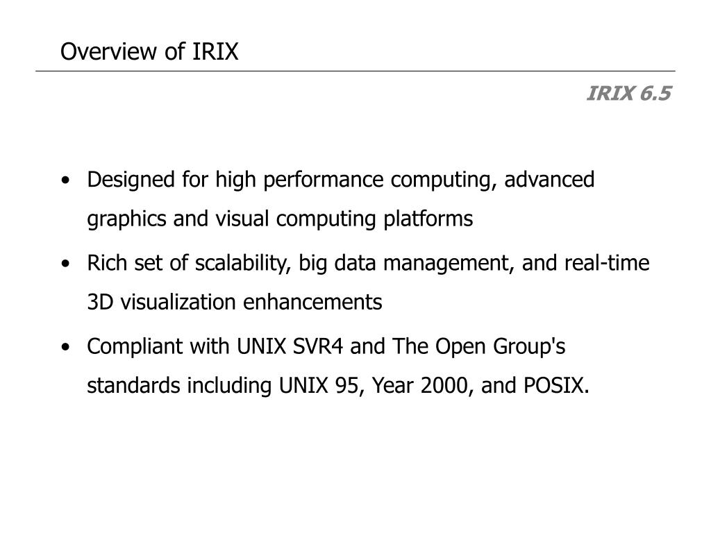 Overview of IRIX IRIX 6.5 • Designed for high performance computing, advanced graphics and visual computing platforms • Rich set of scalability, big data management, and real-time 3D visualization enhancements • Compliant with UNIX SVR4 and The Open Group's standards including UNIX 95, Year 2000, and POSIX.