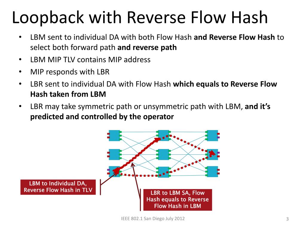 Loopback without Reverse Flow Hash Cited from bp-mackcrane-ECMP-CFM-0412.ppt: • LBMs sent to individual DA with Flow Hash to select path • LBM MIP TLV contains MIP address • MIP responds with LBR • LBR may take different path from LBM • Could add Flow Hash TLV to LBM to attempt to make LBR symmetric… • But there is no guarantee that LBR is symmetric if network is misbehaving! LBM to Individual DA,MIP address in TLV LBR to LBM SA IEEE 802.1 San Diego July 2012