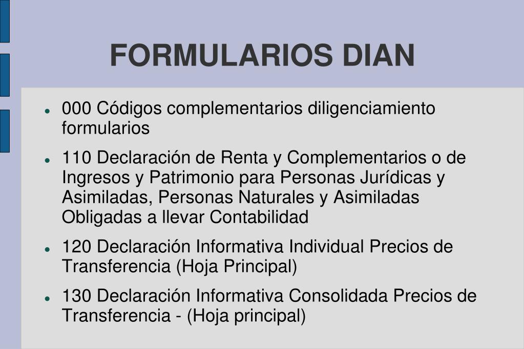 FORMULARIOS DIAN • 000 Códigos complementarios diligenciamiento formularios • 110 Declaración de Renta y Complementarios o de Ingresos y Patrimonio para Personas Jurídicas y Asimiladas, Personas Naturales y Asimiladas Obligadas a llevar Contabilidad • 120 Declaración Informativa Individual Precios de Transferencia (Hoja Principal) • 130 Declaración Informativa Consolidada Precios de Transferencia - (Hoja principal)