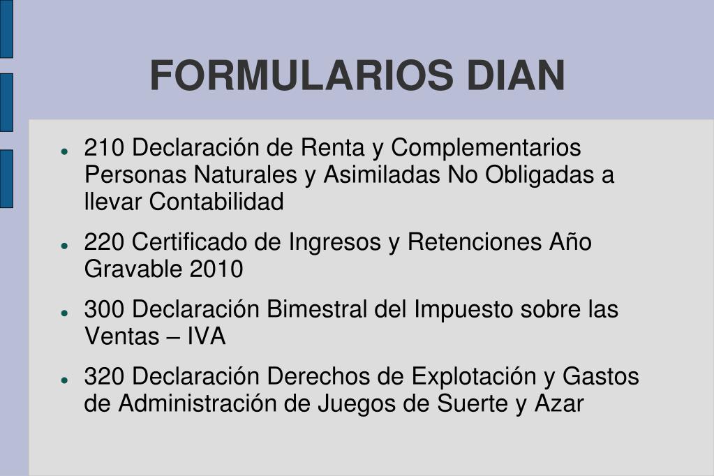 FORMULARIOS DIAN • 210 Declaración de Renta y Complementarios Personas Naturales y Asimiladas No Obligadas a llevar Contabilidad • 220 Certificado de Ingresos y Retenciones Año Gravable 2010 • 300 Declaración Bimestral del Impuesto sobre las Ventas – IVA • 320 Declaración Derechos de Explotación y Gastos de Administración de Juegos de Suerte y Azar