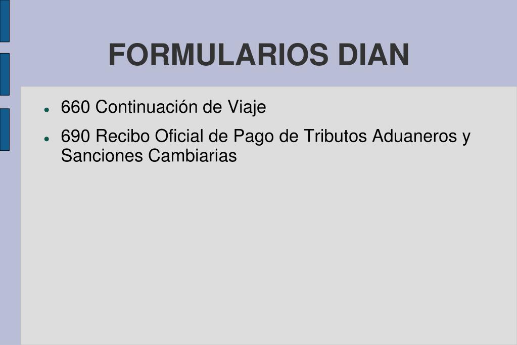 FORMULARIOS DIAN • 660 Continuación de Viaje • 690 Recibo Oficial de Pago de Tributos Aduaneros y Sanciones Cambiarias