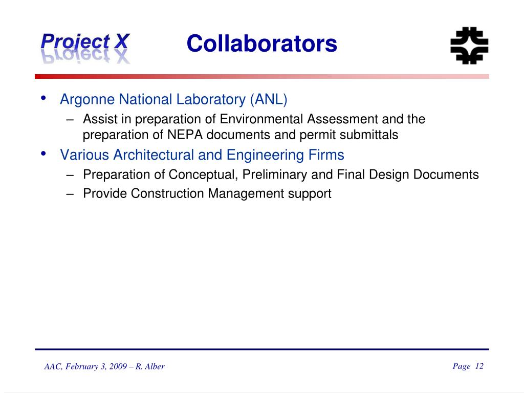 Collaborators • Argonne National Laboratory (ANL) • Assist in preparation of Environmental Assessment and the preparation of NEPA documents and permit submittals • Various Architectural and Engineering Firms • Preparation of Conceptual, Preliminary and Final Design Documents • Provide Construction Management support