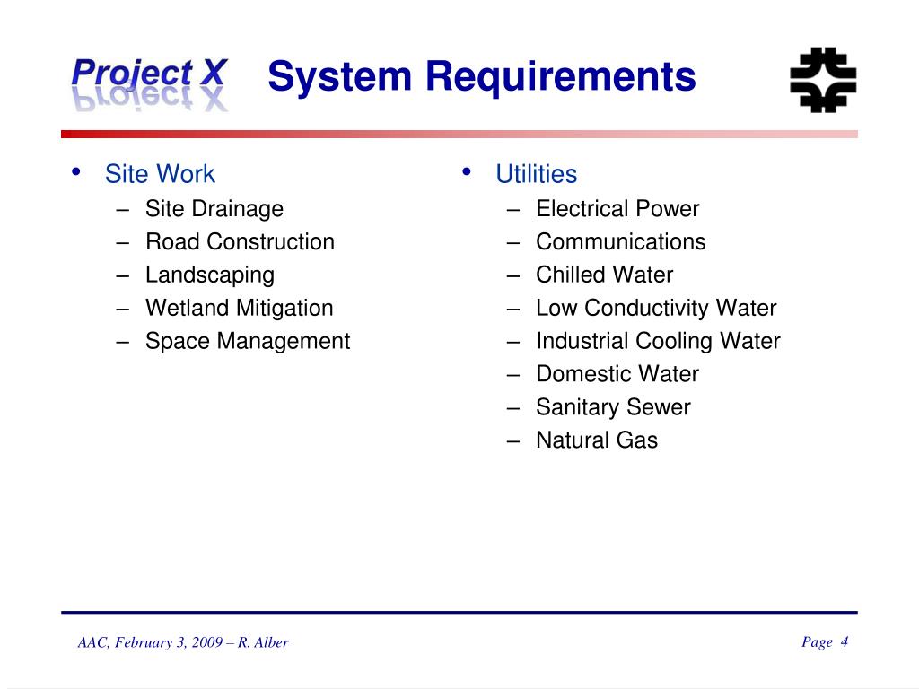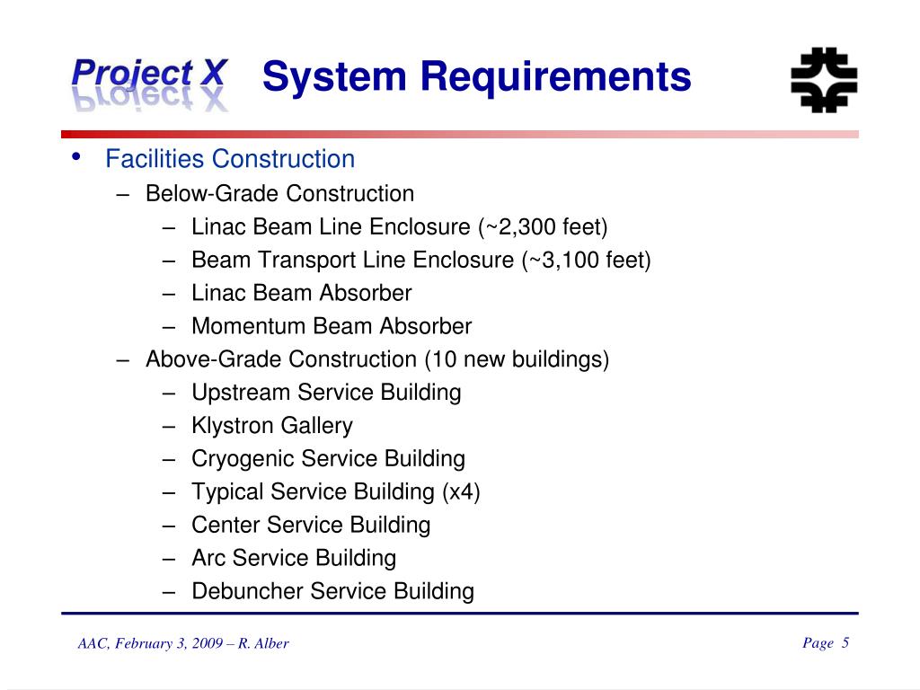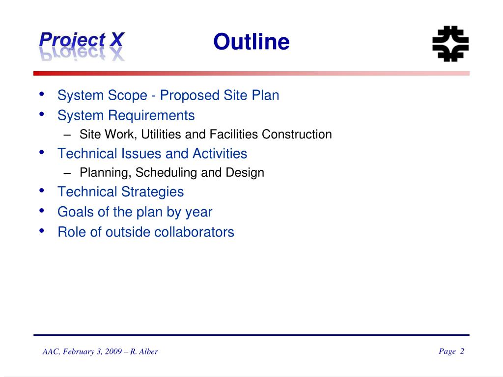 Project X RD&D Plan Conventional Facilities (Civil Construction). Russ Alber AAC Meeting February 3, 2009. Outline. System Scope - Proposed Site Plan System Requirements Site Work, Utilities and Facilities Construction Technical Issues and Activities Planning, Scheduling and Design