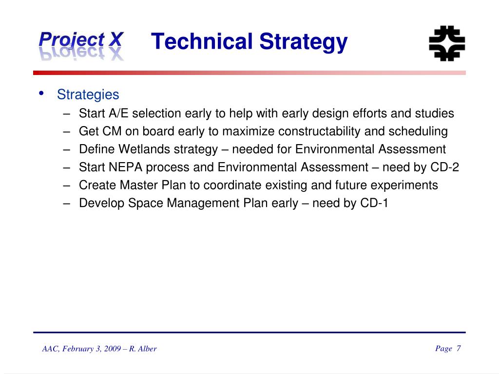 Technical Strategy • Strategies • Start A/E selection early to help with early design efforts and studies • Get CM on board early to maximize constructability and scheduling • Define Wetlands strategy – needed for Environmental Assessment • Start NEPA process and Environmental Assessment – need by CD-2 • Create Master Plan to coordinate existing and future experiments • Develop Space Management Plan early – need by CD-1