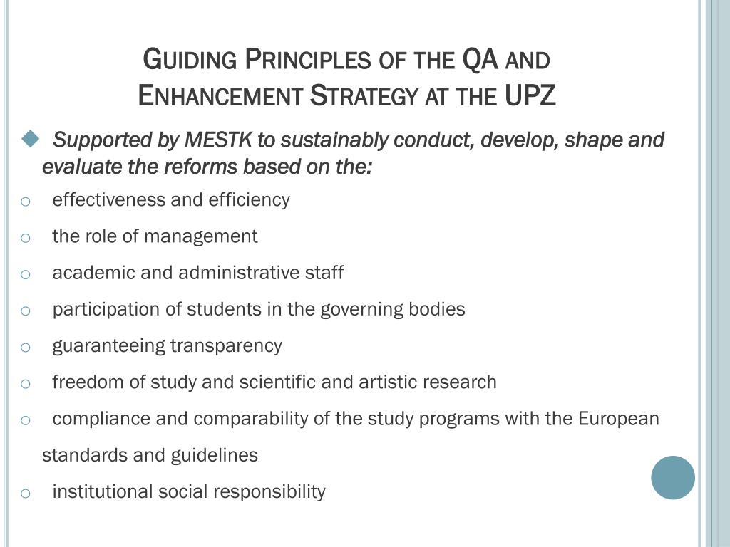 Guiding Principles of the QA andEnhancement Strategy at the UPZ • Supported by MESTK to sustainably conduct, develop, shape and evaluate the reforms based on the: • effectiveness and efficiency • the role of management • academic and administrative staff • participation of students in the governing bodies • guaranteeing transparency • freedom of study and scientific and artistic research • compliance and comparability of the study programs with the European standards and guidelines • institutional social responsibility