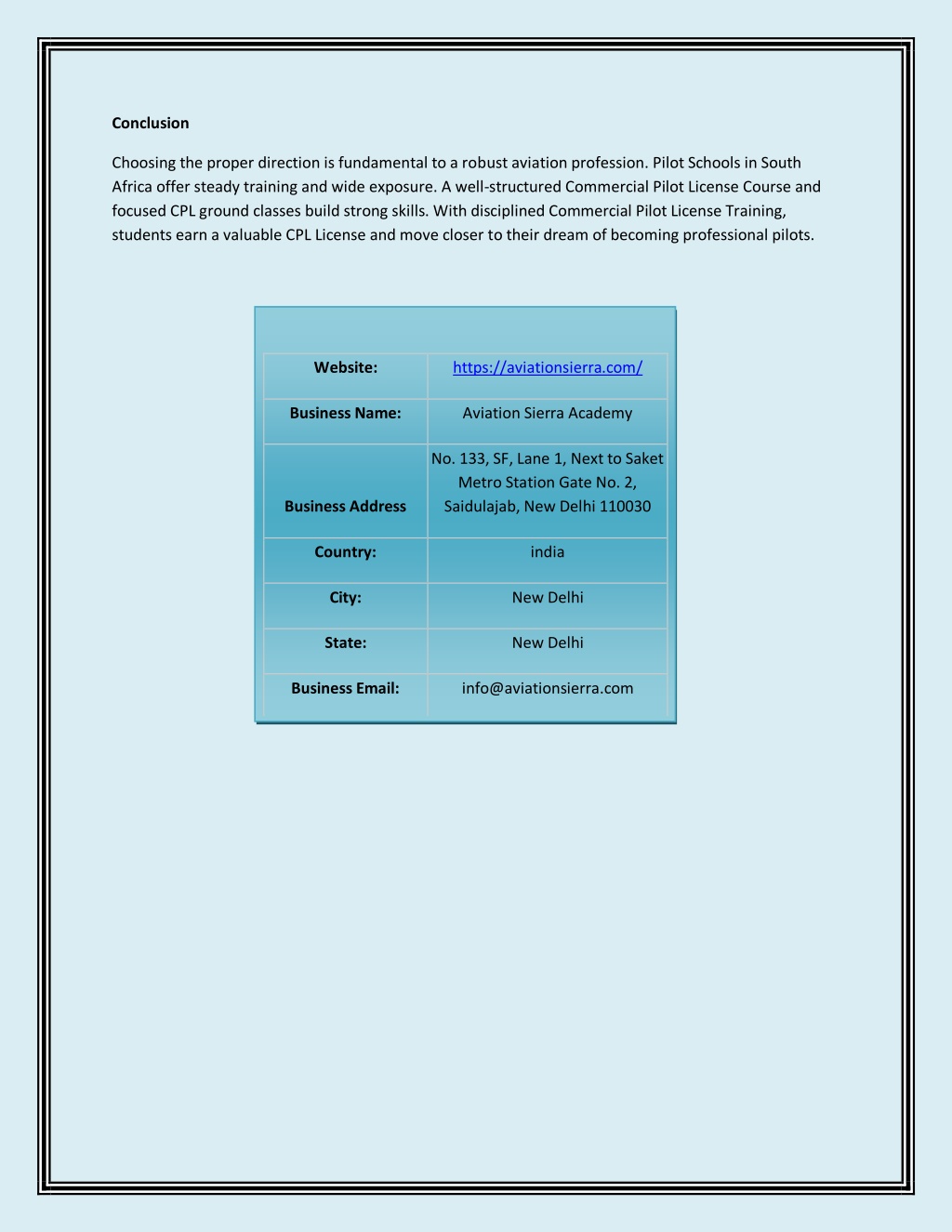Conclusion Choosing the proper direction is fundamental to a robust aviation profession. Pilot Schools in South Africa offer steady training and wide exposure. A well-structured Commercial Pilot License Course and focused CPL ground classes build strong skills. With disciplined Commercial Pilot License Training, students earn a valuable CPL License and move closer to their dream of becoming professional pilots. Website: https://aviationsierra.com/ Business Name: Aviation Sierra Academy No. 133, SF, Lane 1, Next to Saket Metro Station Gate No. 2, Saidulajab, New Delhi 110030 Business Address Country: india City: New Delhi State: New Delhi Business Email: info@aviationsierra.com