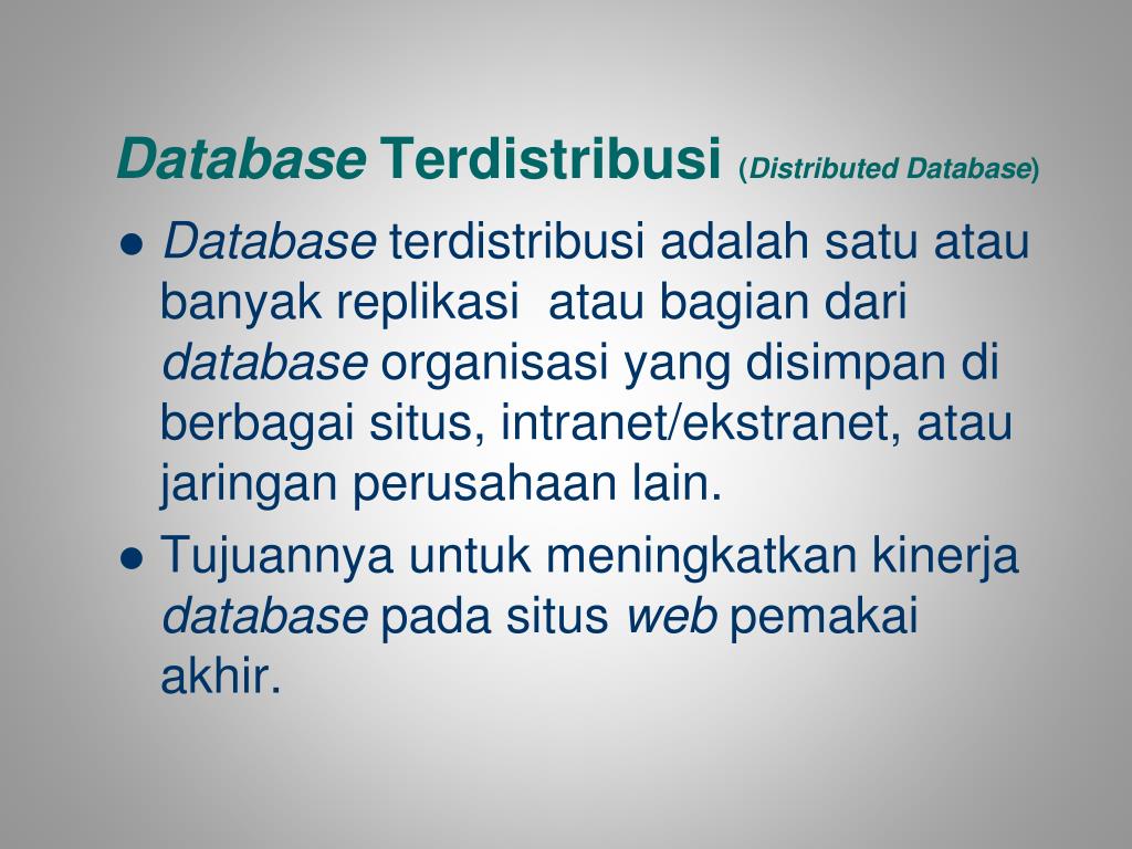 Database Terdistribusi (Distributed Database) • Database terdistribusi adalah satu atau banyak replikasi atau bagian dari database organisasi yang disimpan di berbagai situs, intranet/ekstranet, atau jaringan perusahaan lain. • Tujuannya untuk meningkatkan kinerja database pada situs web pemakai akhir.