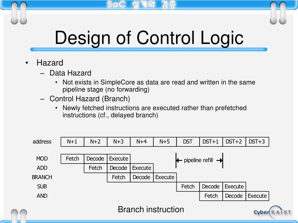Design of Control Logic • Hazard • Data Hazard • Not exists in SimpleCore as data are read and written in the same pipeline stage (no forwarding) • Control Hazard (Branch) • Newly fetched instructions are executed rather than prefetched instructions (cf., delayed branch) Branch instruction
