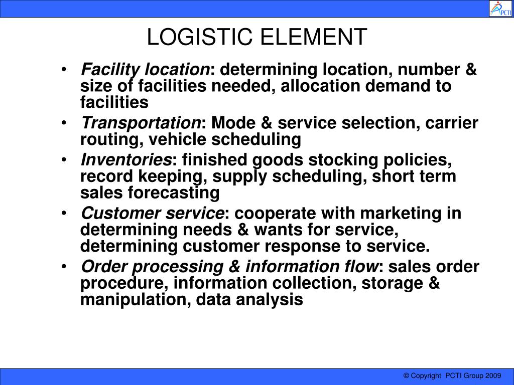 LOGISTIC ELEMENT • Facility location: determining location, number & size of facilities needed, allocation demand to facilities • Transportation: Mode & service selection, carrier routing, vehicle scheduling • Inventories: finished goods stocking policies, record keeping, supply scheduling, short term sales forecasting • Customer service: cooperate with marketing in determining needs & wants for service, determining customer response to service. • Order processing & information flow: sales order procedure, information collection, storage & manipulation, data analysis
