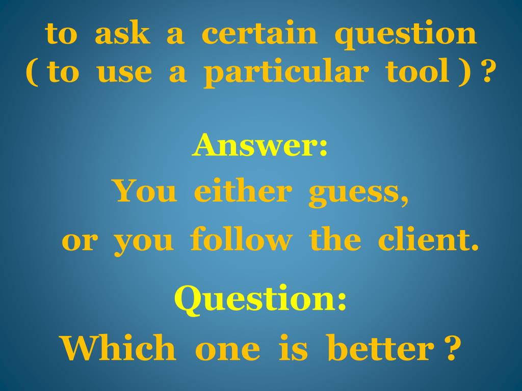 to ask a certain question ( to use a particular tool ) ? Answer: You either guess, or you follow the client. Question: Which one is better ?