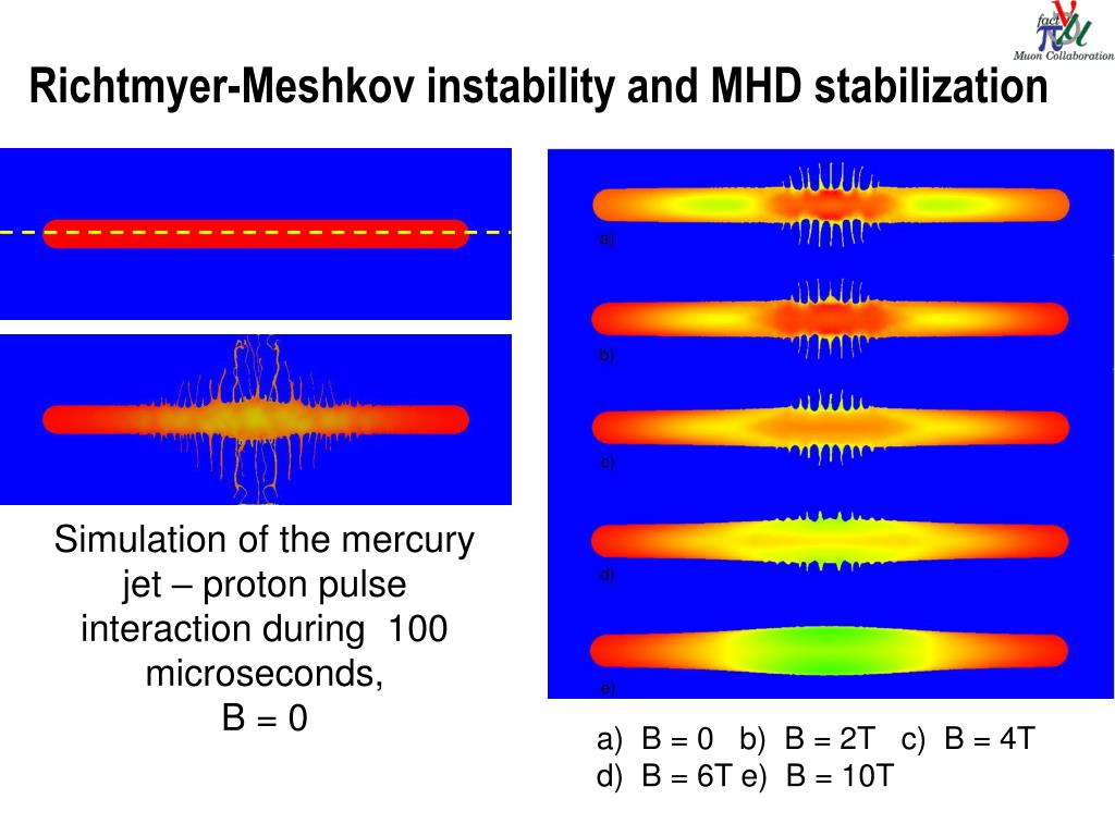 Richtmyer-Meshkov instability and MHD stabilization Simulation of the mercury jet – proton pulse interaction during 100 microseconds,B = 0 a) B = 0 b) B = 2T c) B = 4T d) B = 6T e) B = 10T