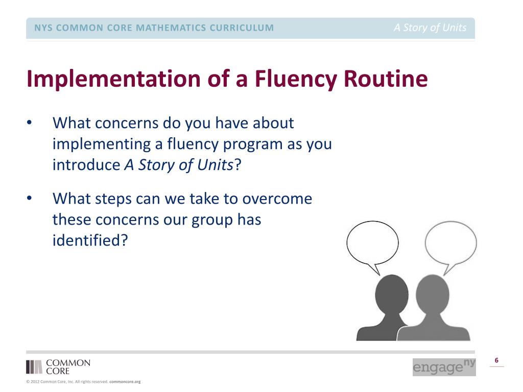 Implementation of a Fluency Routine • What concerns do you have about implementing a fluency program as you introduce A Story of Units? • What steps can we take to overcome these concerns our group has identified?