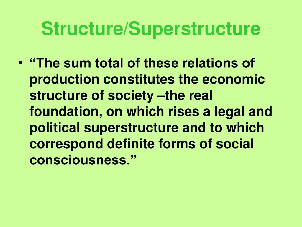 Structure/Superstructure • “The sum total of these relations of production constitutes the economic structure of society –the real foundation, on which rises a legal and political superstructure and to which correspond definite forms of social consciousness.”