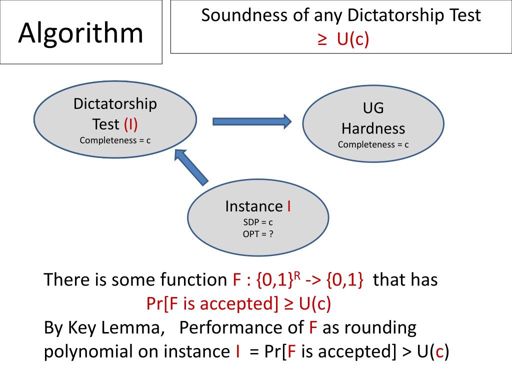 Soundness of any Dictatorship Test ≥ U(c) Algorithm Any Dictatorship Test Completeness = c Dictatorship Test (I) Completeness = c UG Hardness Completeness = c Instance I SDP = c OPT = ? There is some function F : {0,1}R -> {0,1} that has Pr[F is accepted] ≥ U(c) By Key Lemma, Performance of F as rounding polynomial on instance I = Pr[F is accepted] > U(c)