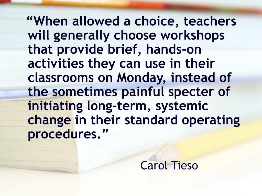 “When allowed a choice, teachers will generally choose workshops that provide brief, hands-on activities they can use in their classrooms on Monday, instead of the sometimes painful specter of initiating long-term, systemic change in their standard operating procedures.” Carol Tieso