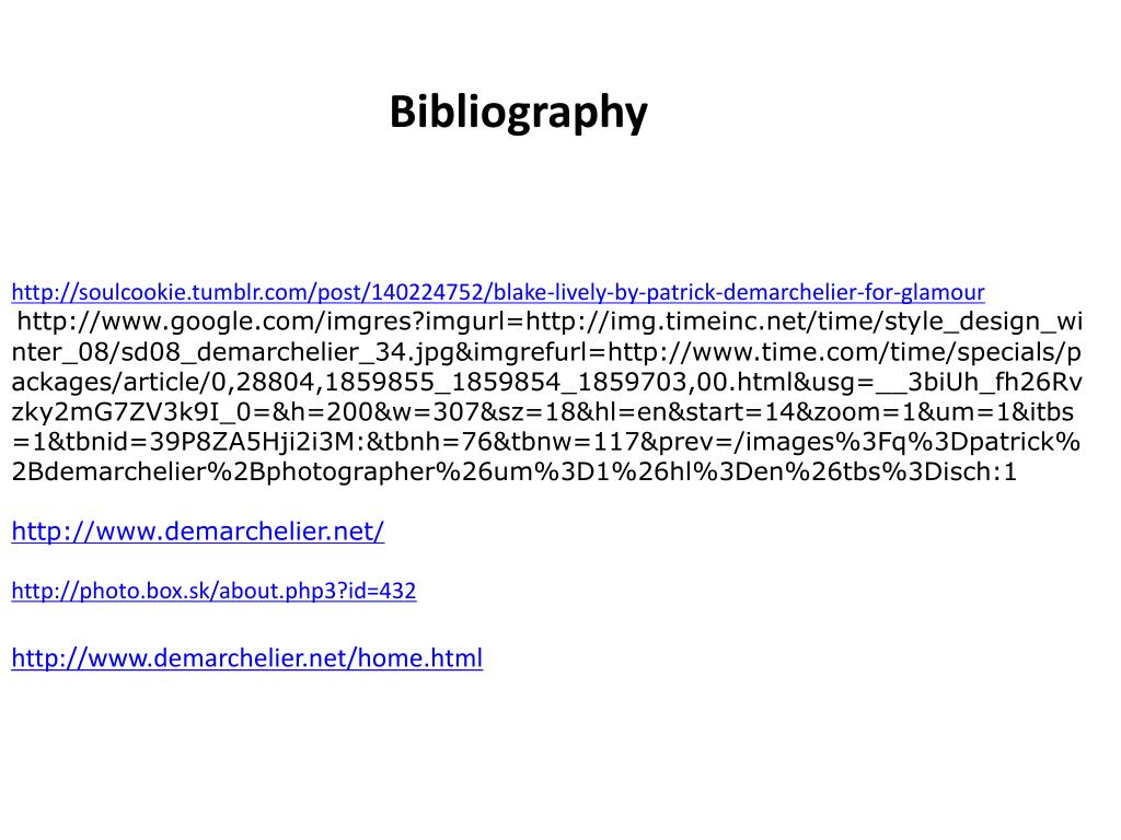 Bibliography • http://soulcookie.tumblr.com/post/140224752/blake-lively-by-patrick-demarchelier-for-glamour • http://www.google.com/imgres?imgurl=http://img.timeinc.net/time/style_design_winter_08/sd08_demarchelier_34.jpg&imgrefurl=http://www.time.com/time/specials/packages/article/0,28804,1859855_1859854_1859703,00.html&usg=__3biUh_fh26Rvzky2mG7ZV3k9I_0=&h=200&w=307&sz=18&hl=en&start=14&zoom=1&um=1&itbs=1&tbnid=39P8ZA5Hji2i3M:&tbnh=76&tbnw=117&prev=/images%3Fq%3Dpatrick%2Bdemarchelier%2Bphotographer%26um%3D1%26hl%3Den%26tbs%3Disch:1 • http://www.demarchelier.net/ • http://photo.box.sk/about.php3?id=432 • http://www.demarchelier.net/home.html