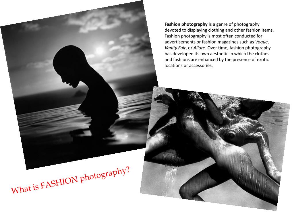 Fashion photography is a genre of photography devoted to displaying clothing and other fashion items. Fashion photography is most often conducted for advertisements or fashion magazines such as Vogue, Vanity Fair, or Allure. Over time, fashion photography has developed its own aesthetic in which the clothes and fashions are enhanced by the presence of exotic locations or accessories. What is FASHION photography?