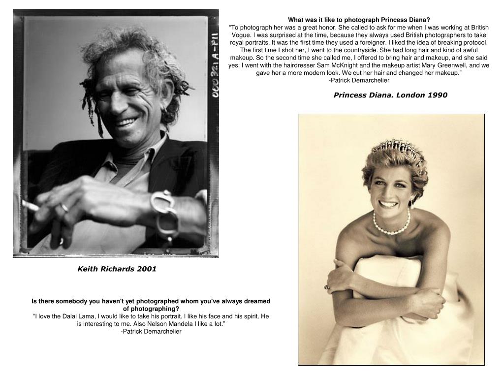 What was it like to photograph Princess Diana?“To photograph her was a great honor. She called to ask for me when I was working at British Vogue. I was surprised at the time, because they always used British photographers to take royal portraits. It was the first time they used a foreigner. I liked the idea of breaking protocol. The first time I shot her, I went to the countryside. She had long hair and kind of awful makeup. So the second time she called me, I offered to bring hair and makeup, and she said yes. I went with the hairdresser Sam McKnight and the makeup artist Mary Greenwell, and we gave her a more modern look. We cut her hair and changed her makeup.” -Patrick Demarchelier Princess Diana. London 1990 Keith Richards 2001 Is there somebody you haven't yet photographed whom you've always dreamed of photographing?“I love the Dalai Lama, I would like to take his portrait. I like his face and his spirit. He is interesting to me. Also Nelson Mandela I like a lot.” -Patrick Demarchelier