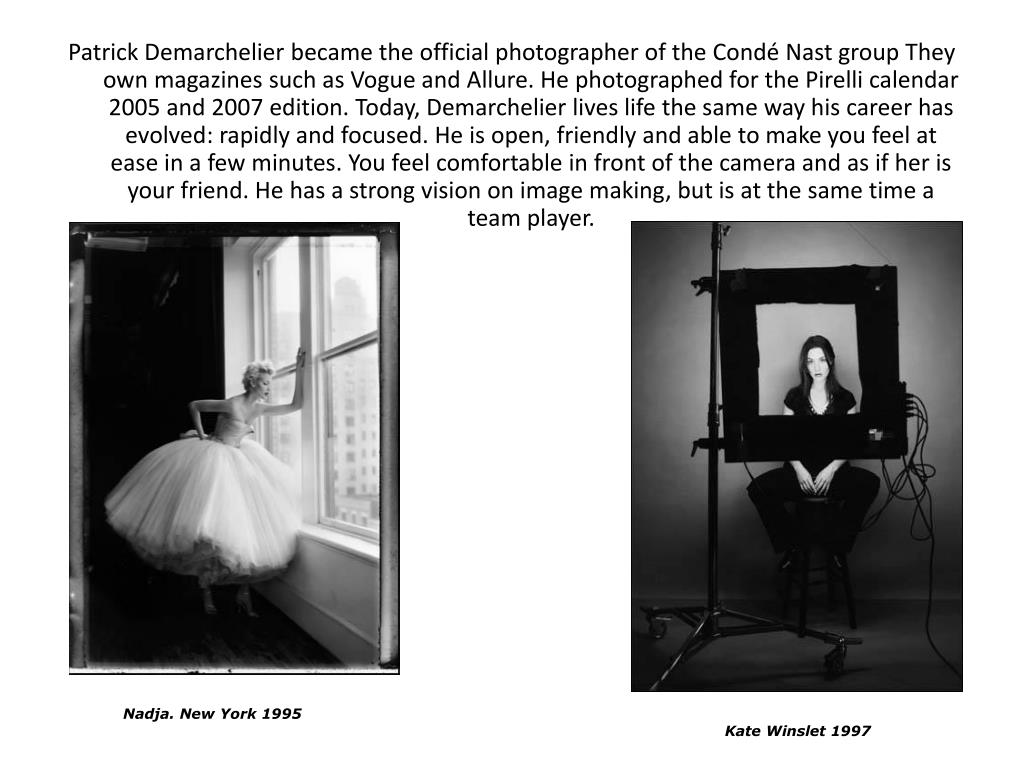 Patrick Demarchelierbecame the official photographer of the Condé Nast group They own magazines such as Vogue and Allure. He photographed for the Pirelli calendar 2005 and 2007 edition. Today, Demarchelierlives life the same way his career has evolved: rapidly and focused. He is open, friendly and able to make you feel at ease in a few minutes. You feel comfortable in front of the camera and as if her is your friend. He has a strong vision on image making, but is at the same time a team player. Nadja. New York 1995 Kate Winslet 1997