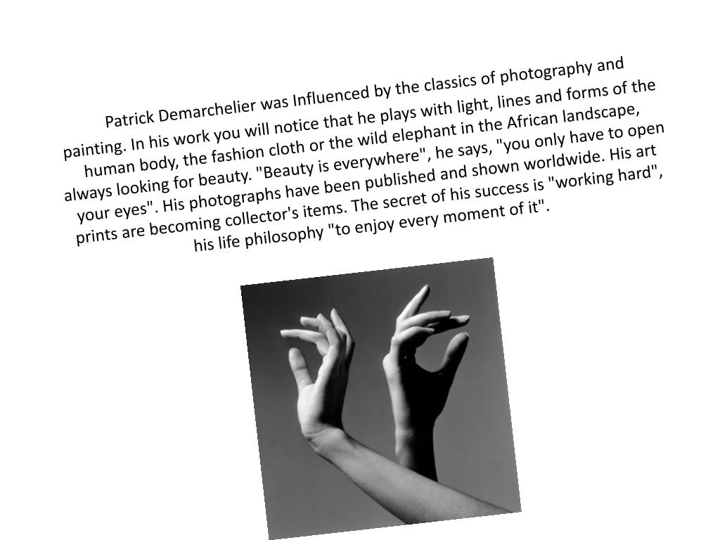 Patrick Demarchelier was Influenced by the classics of photography and painting. In his work you will notice that heplays with light, lines and forms of the human body, the fashion cloth or the wild elephant in the African landscape, always looking for beauty. "Beauty is everywhere", he says, "you only have to open your eyes". His photographs have been published and shown worldwide. His art prints are becoming collector's items. The secret of his success is "working hard", his life philosophy "to enjoy every moment of it".