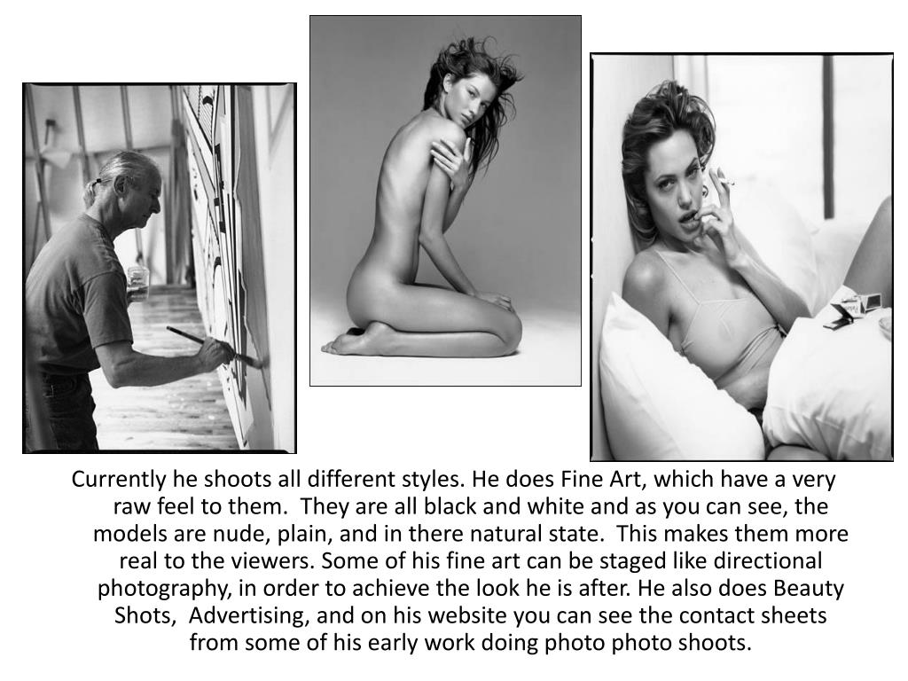 Currently he shoots all different styles. He does Fine Art, which have a very raw feel to them. They are all black and white and as you can see, the models are nude, plain, and in there natural state. This makes them more real to the viewers. Some of his fine art can be staged like directional photography, in order to achieve the look he is after. He also does Beauty Shots, Advertising, and on his website you can see the contact sheets from some of his early work doing photo photoshoots.