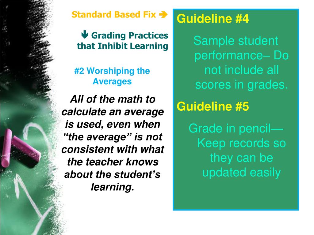 Standard Based Fix Grading Practices that Inhibit Learning Guideline #4 Sample student performance– Do not include all scores in grades. Guideline #5 Grade in pencil—Keep records so they can be updated easily #2 Worshiping the Averages All of the math to calculate an average is used, even when “the average” is not consistent with what the teacher knows about the student’s learning.