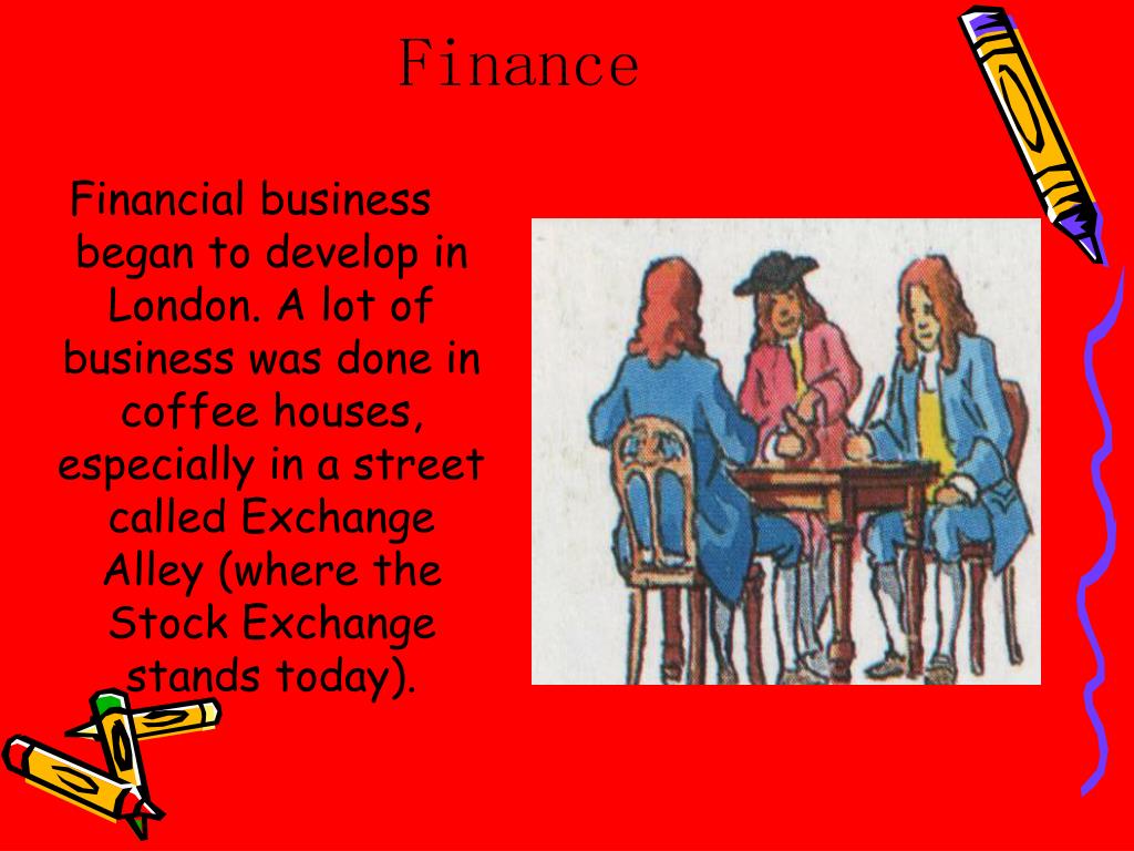 Finance Financial business began to develop in London. A lot of business was done in coffee houses, especially in a street called Exchange Alley (where the Stock Exchange stands today).
