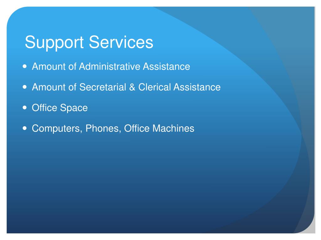 Support Services • Amount of Administrative Assistance • Amount of Secretarial & Clerical Assistance • Office Space • Computers, Phones, Office Machines