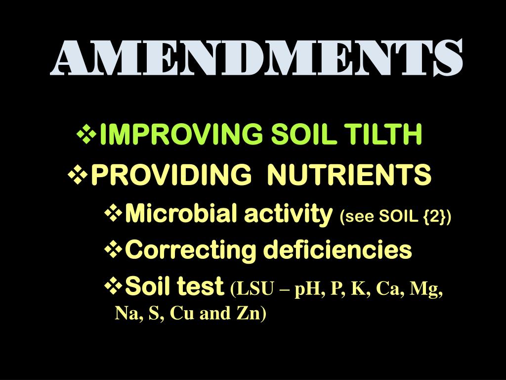 AMENDMENTS • IMPROVING SOIL TILTH • PROVIDING NUTRIENTS • Microbial activity (see SOIL {2}) • Correcting deficiencies • Soil test (LSU – pH, P, K, Ca, Mg, Na, S, Cu and Zn)