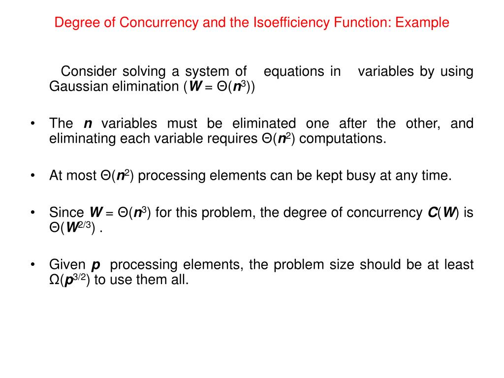 Degree of Concurrency and the Isoefficiency Function: Example Consider solving a system of equations in variables by using Gaussian elimination (W = Θ(n3)) • The n variables must be eliminated one after the other, and eliminating each variable requires Θ(n2) computations. • At most Θ(n2) processing elements can be kept busy at any time. • Since W = Θ(n3) for this problem, the degree of concurrency C(W) is Θ(W2/3) . • Given p processing elements, the problem size should be at least Ω(p3/2) to use them all.