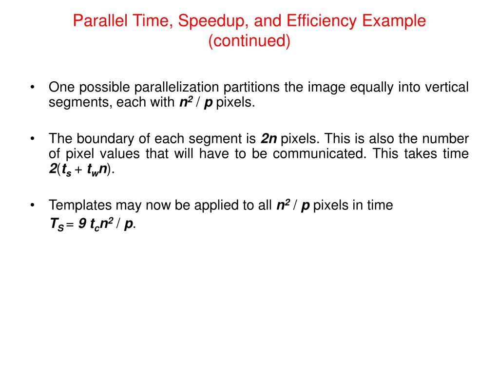 Parallel Time, Speedup, and Efficiency Example (continued) • One possible parallelization partitions the image equally into vertical segments, each with n2 / p pixels. • The boundary of each segment is 2n pixels. This is also the number of pixel values that will have to be communicated. This takes time 2(ts + twn). • Templates may now be applied to all n2 / p pixels in time TS= 9tcn2 / p.