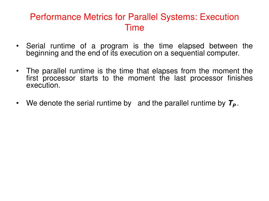 Performance Metrics for Parallel Systems: Execution Time • Serial runtime of a program is the time elapsed between the beginning and the end of its execution on a sequential computer. • The parallel runtime is the time that elapses from the moment the first processor starts to the moment the last processor finishes execution. • We denote the serial runtime by and the parallel runtime by TP .