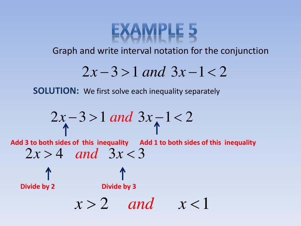 Example 4 Graph and write interval notation for the conjunction SOLUTION: We first solve each inequality retaining the word and Add 5 to both sides Subtract 2 from both sides Divide both sides by 2 Divide both sides by 5