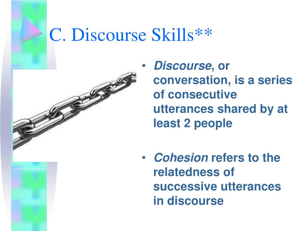 C. Discourse Skills** • Discourse, or conversation, is a series of consecutive utterances shared by at least 2 people • Cohesion refers to the relatedness of successive utterances in discourse