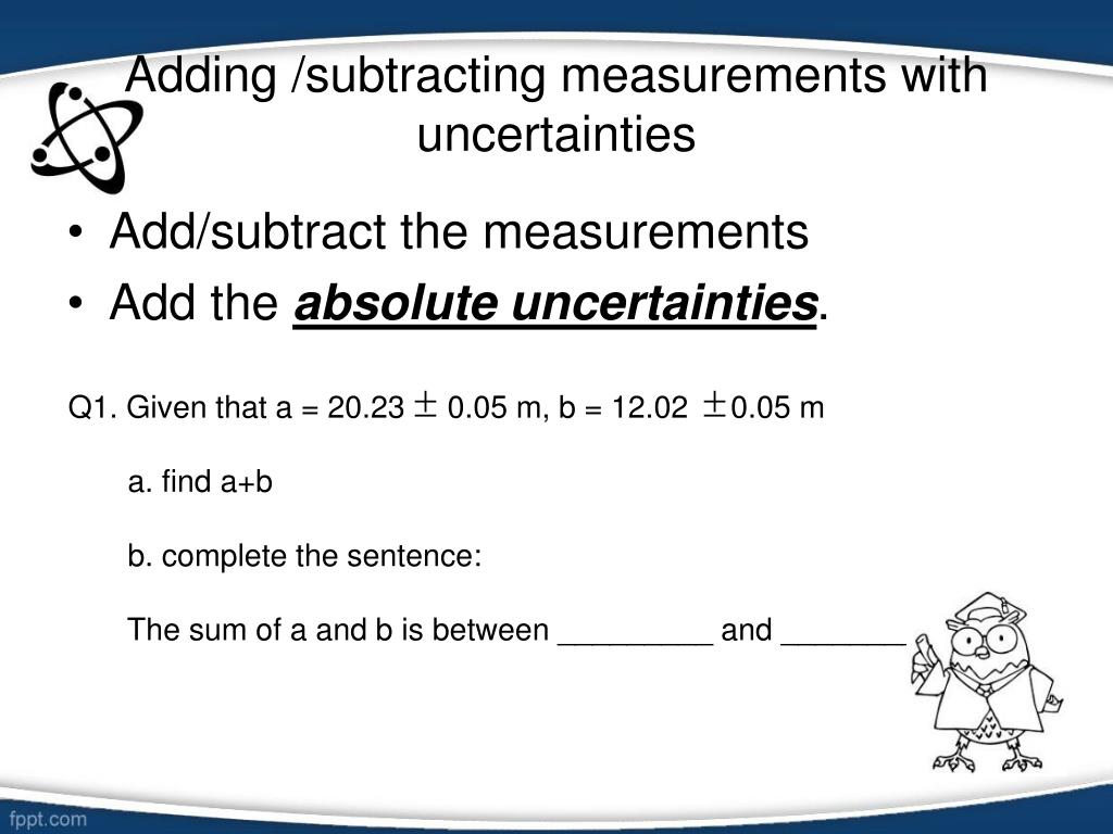 Adding /subtracting measurements with uncertainties • Add/subtract the measurements • Add the absolute uncertainties. Q1. Given that a = 20.23 0.05 m, b = 12.02 0.05 m a. find a+b b. complete the sentence: The sum of a and b is between _________ and __________.