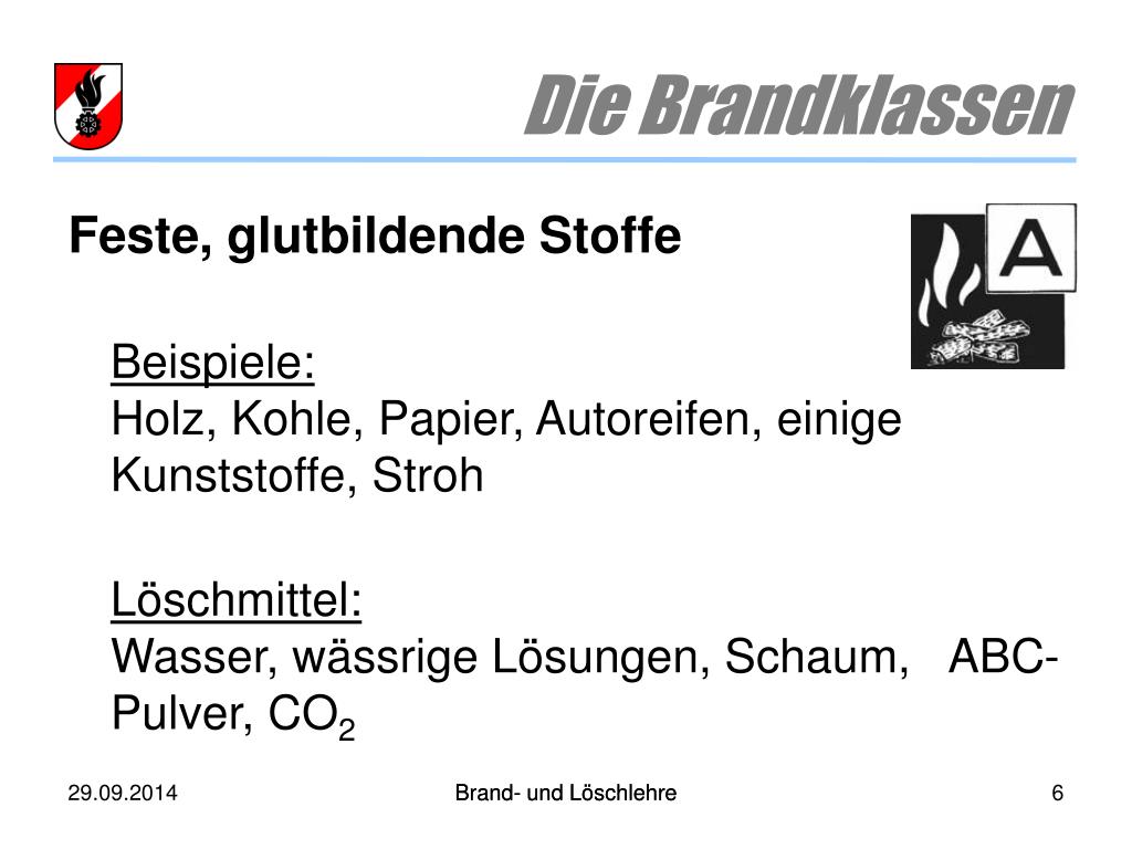 Die Brandklassen Feste, glutbildende Stoffe Beispiele:Holz, Kohle, Papier, Autoreifen, einige Kunststoffe, Stroh Löschmittel: Wasser, wässrige Lösungen, Schaum, ABC-Pulver, CO2 Brand- und Löschlehre Brand- und Löschlehre