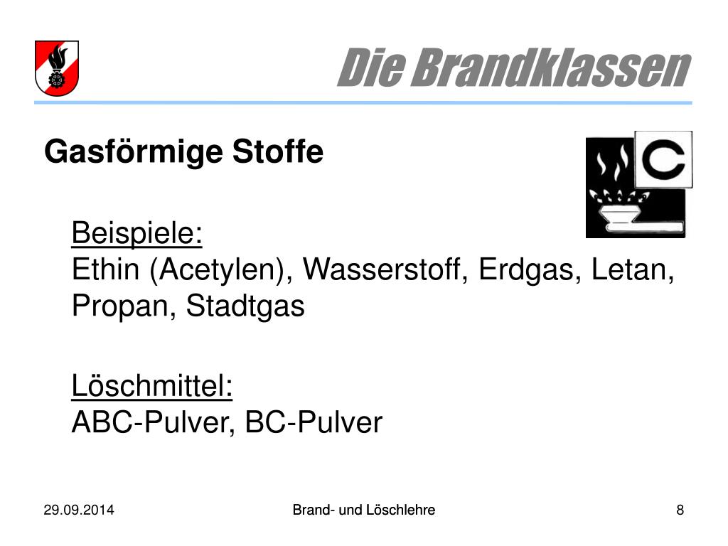Die Brandklassen Gasförmige Stoffe Beispiele:Ethin (Acetylen), Wasserstoff, Erdgas, Letan, Propan, Stadtgas Löschmittel:ABC-Pulver, BC-Pulver Brand- und Löschlehre Brand- und Löschlehre
