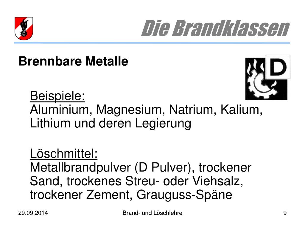 Die Brandklassen Brennbare Metalle Beispiele:Aluminium, Magnesium, Natrium, Kalium, Lithium und deren Legierung Löschmittel:Metallbrandpulver (D Pulver), trockener Sand, trockenes Streu- oder Viehsalz, trockener Zement, Grauguss-Späne Brand- und Löschlehre Brand- und Löschlehre