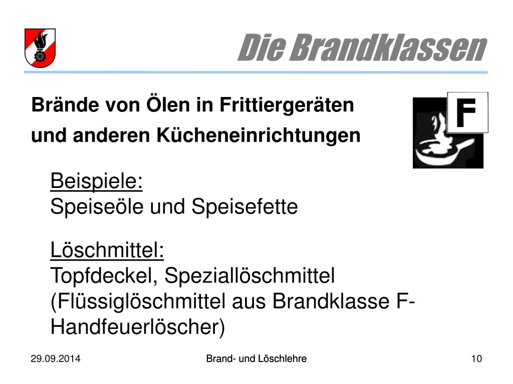 Die Brandklassen Brände von Ölen in Frittiergeräten und anderen Kücheneinrichtungen Beispiele:Speiseöle und Speisefette Löschmittel:Topfdeckel, Speziallöschmittel (Flüssiglöschmittel aus Brandklasse F-Handfeuerlöscher) Brand- und Löschlehre Brand- und Löschlehre