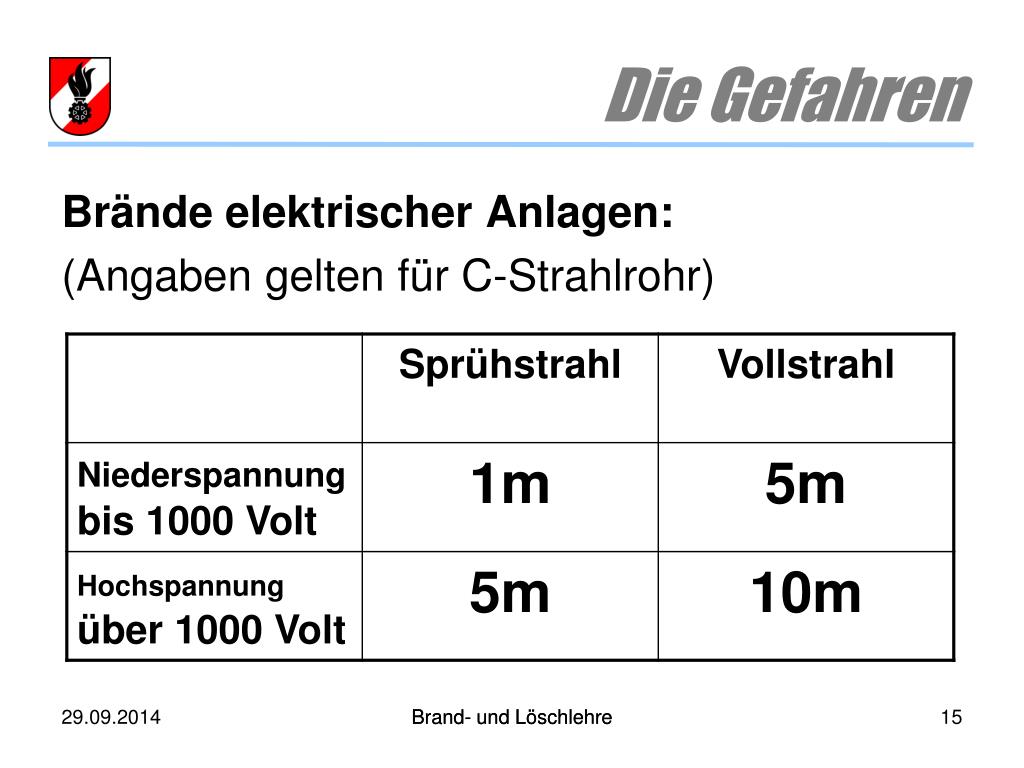 Die Gefahren Brände elektrischer Anlagen: (Angaben gelten für C-Strahlrohr) Brand- und Löschlehre Brand- und Löschlehre