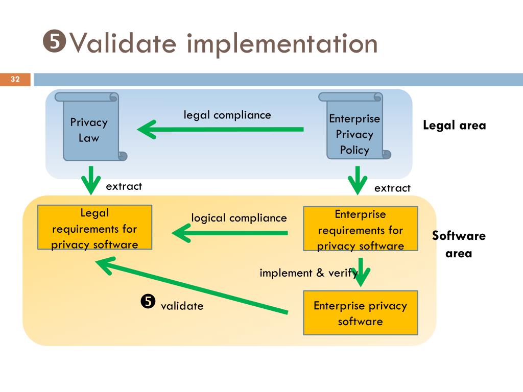 Validate implementation legal compliance Enterprise Privacy Policy Privacy Law Legal area extract extract Legal requirements for privacy software logical compliance Enterprise requirements for privacy software Software area implement & verify Enterprise privacy software validate