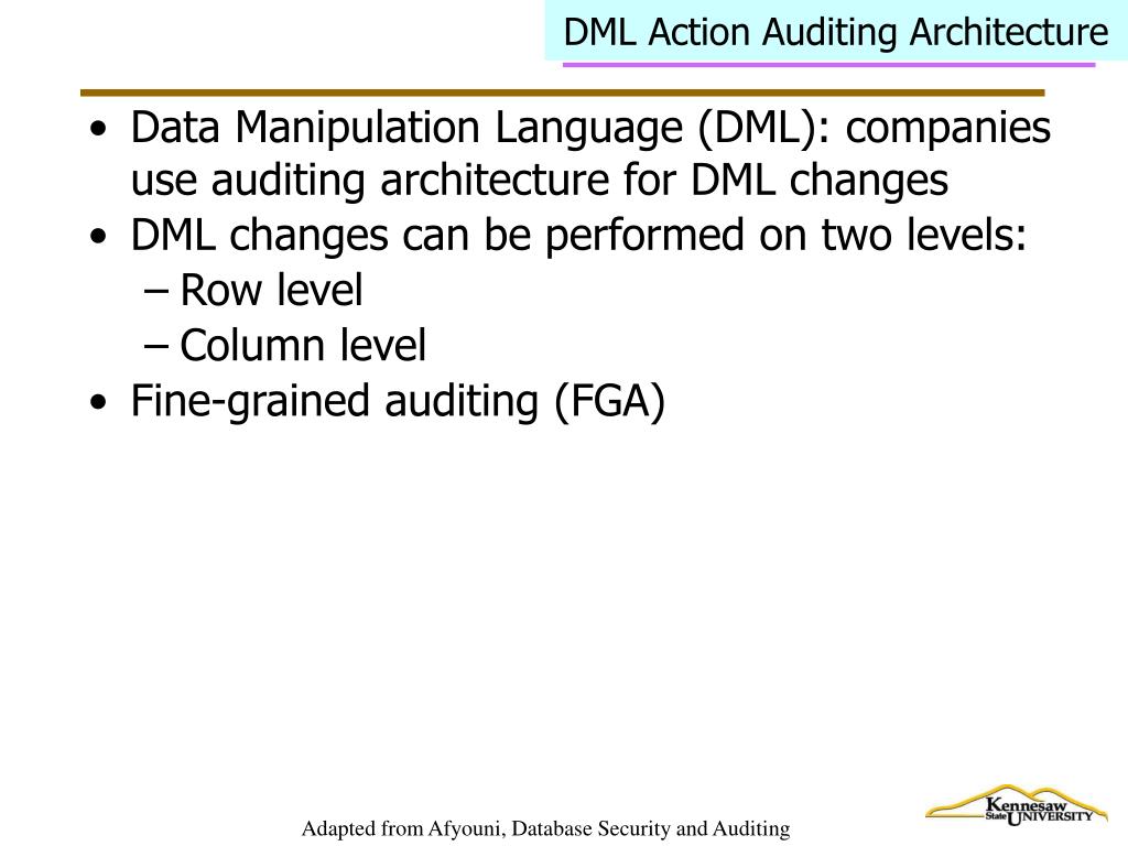 Database Application Auditing – Ch. 8. DML Action Auditing Architecture. Data Manipulation Language (DML): companies use auditing architecture for DML changes DML changes can be performed on two levels: Row level Column level Fine-grained auditing (FGA). DML Action Auditing (cont.).