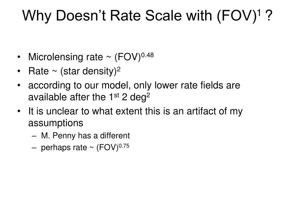 Why Doesn’t Rate Scale with (FOV)1 ? • Microlensing rate ~ (FOV)0.48 • Rate ~ (star density)2 • according to our model, only lower rate fields are available after the 1st 2 deg2 • It is unclear to what extent this is an artifact of my assumptions • M. Penny has a different • perhaps rate ~ (FOV)0.75