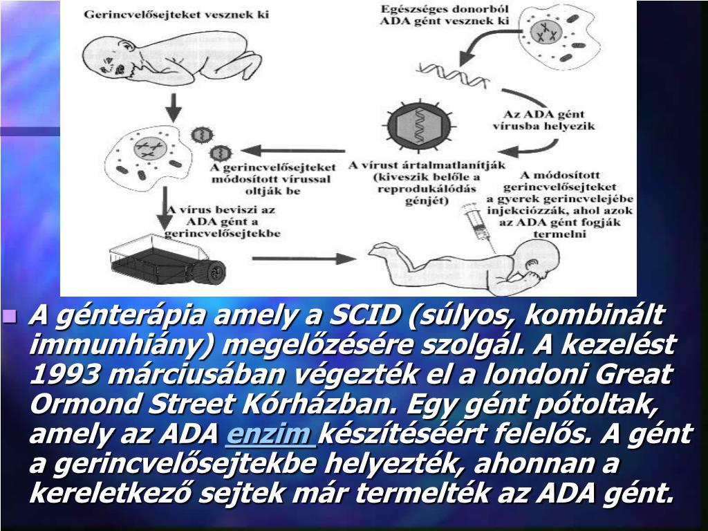 A génterápia amely a SCID (súlyos, kombinált immunhiány) megelőzésére szolgál. A kezelést 1993 márciusában végezték el a londoni Great Ormond Street Kórházban. Egy gént pótoltak, amely az ADA enzim készítéséért felelős. A gént a gerincvelősejtekbe helyezték, ahonnan a kereletkező sejtek már termelték az ADA gént.