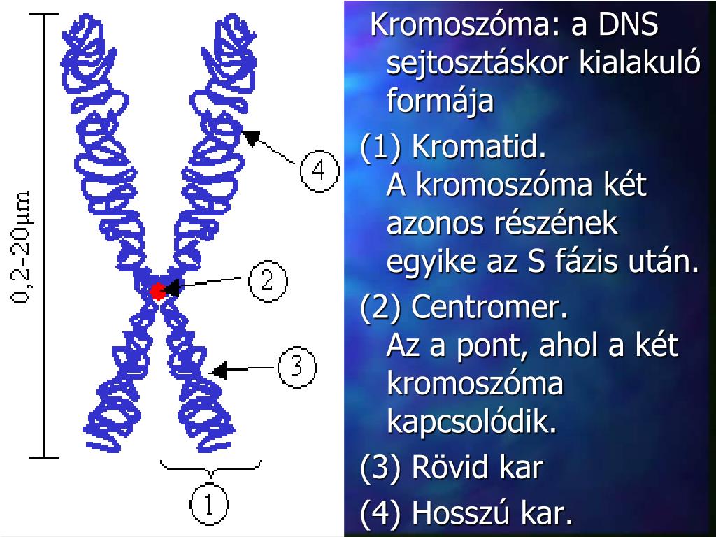 Kromoszóma: a DNS sejtosztáskor kialakuló formája (1) Kromatid. A kromoszóma két azonos részének egyike az S fázis után. (2) Centromer.Az a pont, ahol a két kromoszóma kapcsolódik. (3) Rövid kar (4) Hosszú kar.