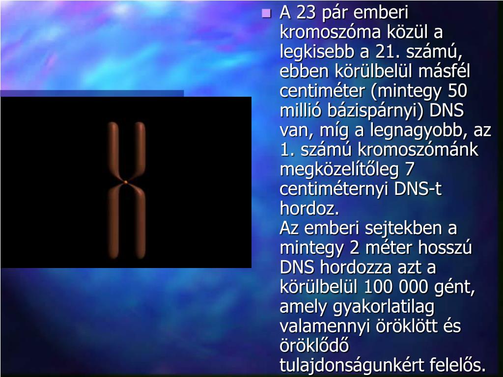 A 23 pár emberi kromoszóma közül a legkisebb a 21. számú, ebben körülbelül másfél centiméter (mintegy 50 millió bázispárnyi) DNS van, míg a legnagyobb, az 1. számú kromoszómánk megközelítőleg 7 centiméternyi DNS-t hordoz. Az emberi sejtekben a mintegy 2 méter hosszú DNS hordozza azt a körülbelül 100 000 gént, amely gyakorlatilag valamennyi öröklött és öröklődő tulajdonságunkért felelős.