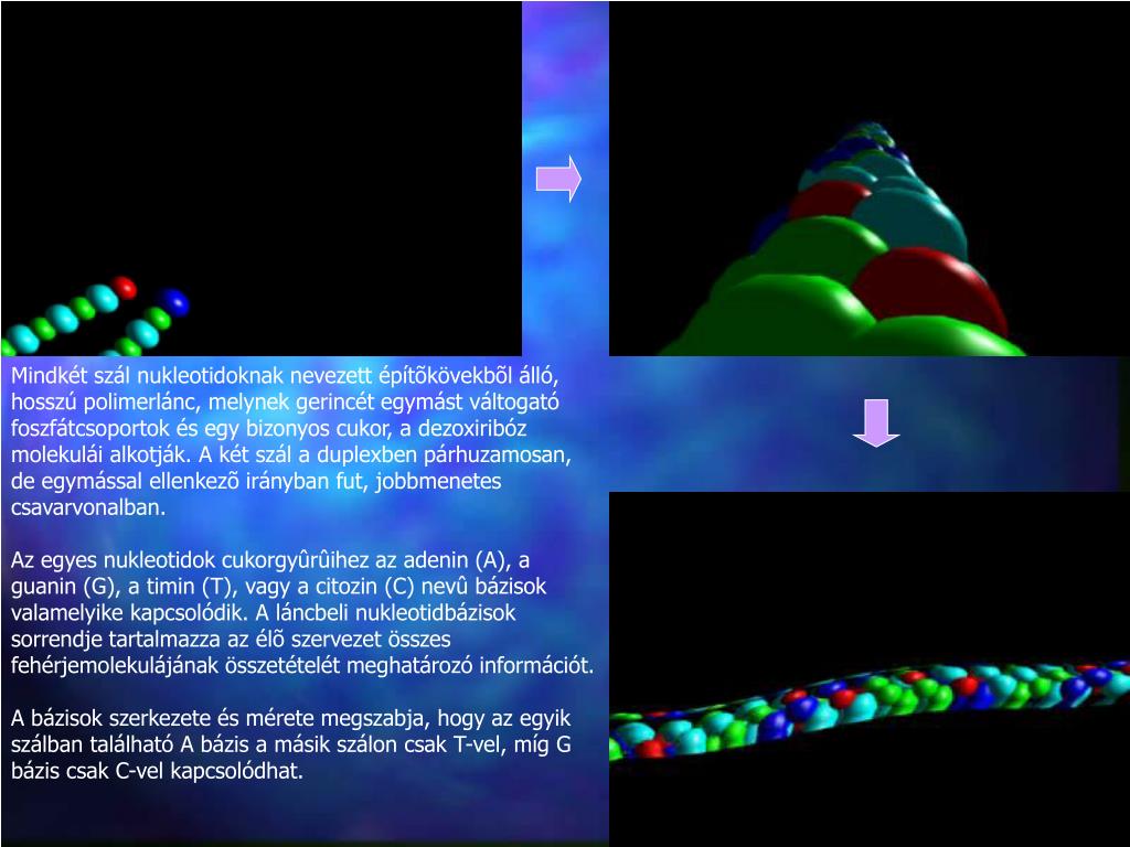 Mindkét szál nukleotidoknak nevezett építõkövekbõl álló, hosszú polimerlánc, melynek gerincét egymást váltogató foszfátcsoportok és egy bizonyos cukor, a dezoxiribóz molekulái alkotják. A két szál a duplexben párhuzamosan, de egymással ellenkezõ irányban fut, jobbmenetes csavarvonalban. Az egyes nukleotidok cukorgyûrûihez az adenin (A), a guanin (G), a timin (T), vagy a citozin (C) nevû bázisok valamelyike kapcsolódik. A láncbeli nukleotidbázisok sorrendje tartalmazza az élõ szervezet összes fehérjemolekulájának összetételét meghatározó információt. A bázisok szerkezete és mérete megszabja, hogy az egyik szálban található A bázis a másik szálon csak T-vel, míg G bázis csak C-vel kapcsolódhat.