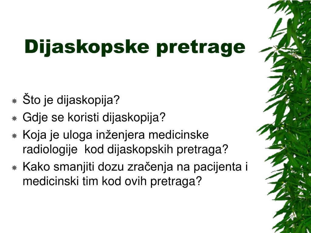 Dijaskopske pretrage • Što je dijaskopija? • Gdje se koristi dijaskopija? • Koja je uloga inženjera medicinske radiologije kod dijaskopskih pretraga? • Kako smanjiti dozu zračenja na pacijenta i medicinski tim kod ovih pretraga?