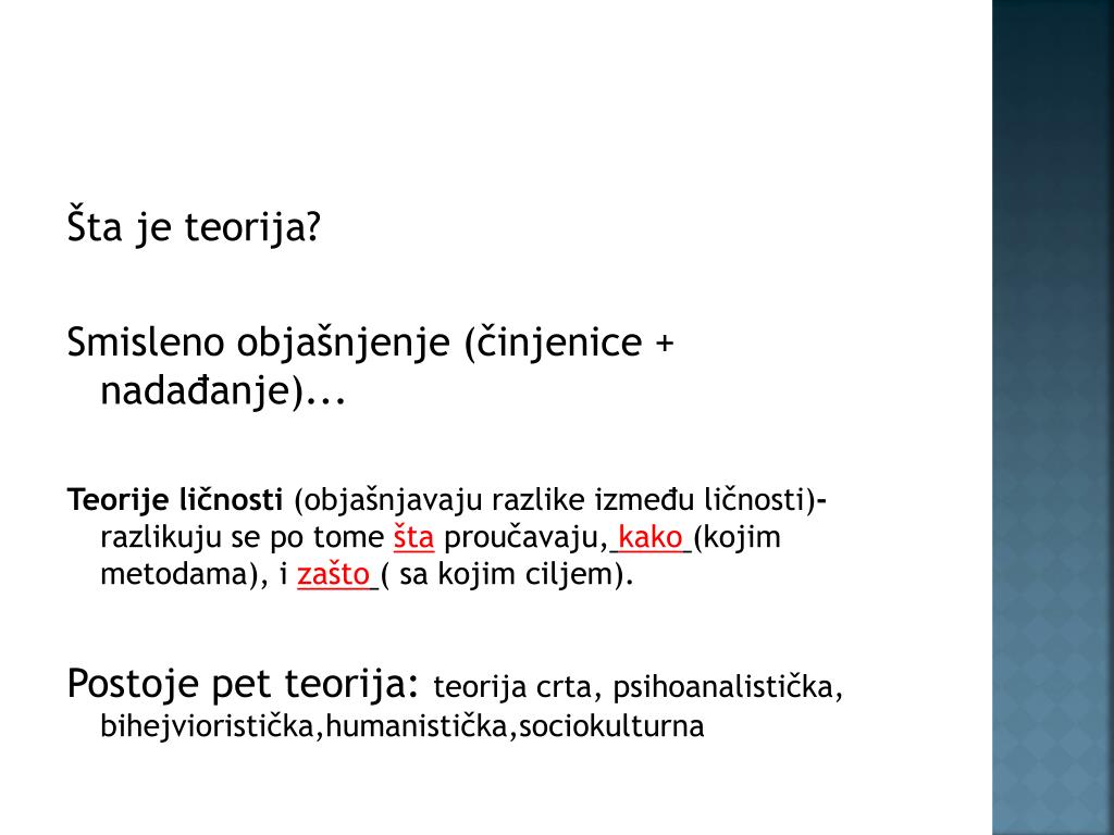 Šta je teorija? Smisleno objašnjenje (činjenice + nadađanje)... Teorije ličnosti (objašnjavaju razlike između ličnosti)- razlikuju se po tomeštaproučavaju,kako(kojim metodama), i zašto( sa kojim ciljem). Postoje pet teorija: teorija crta, psihoanalistička, bihejvioristička,humanistička,sociokulturna